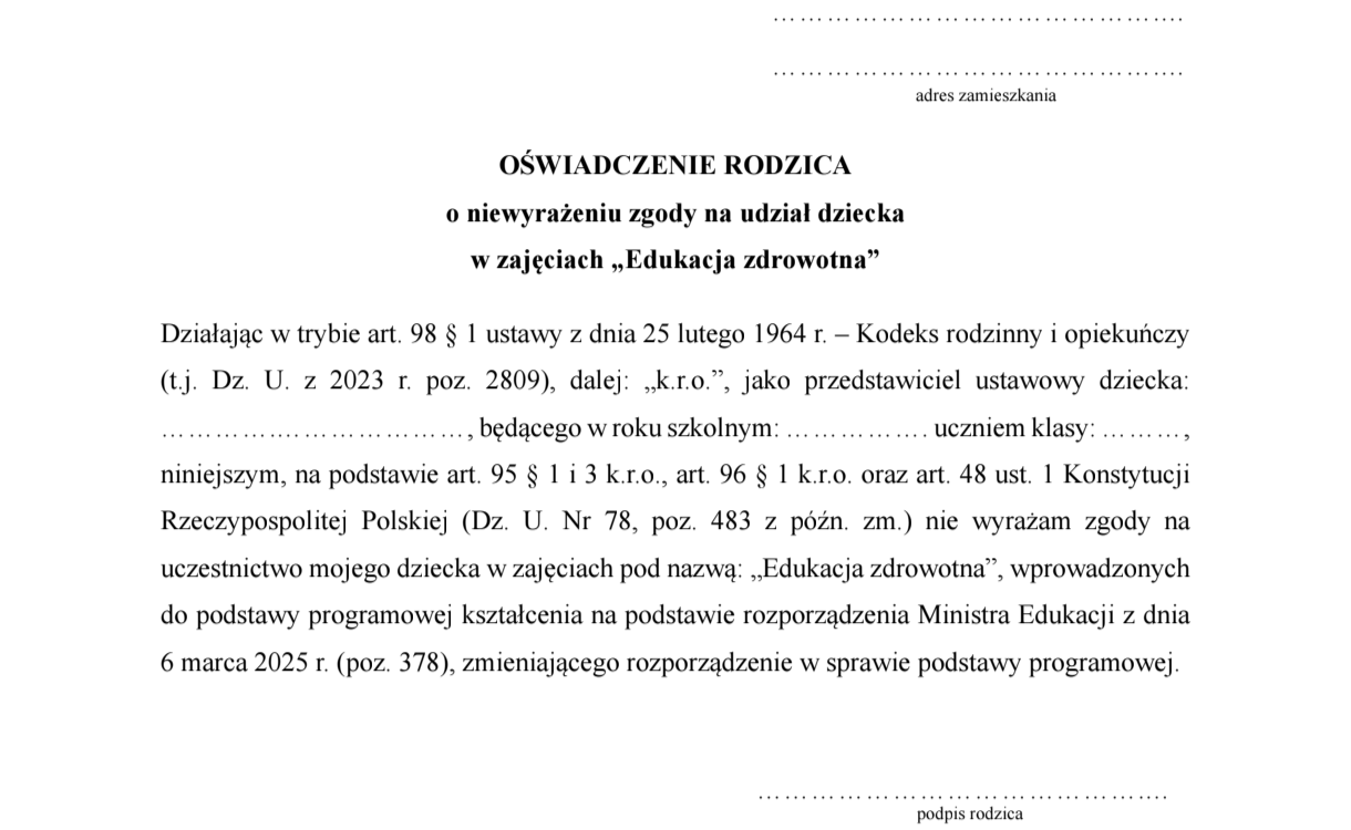 Rezygnacja z edukacji „zdrowotnej” – oświadczenie